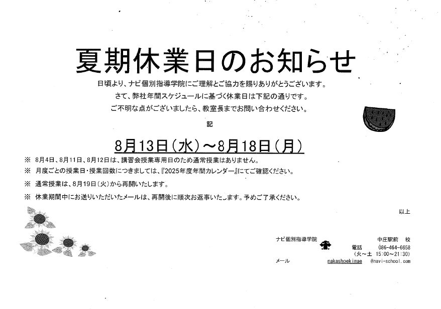 日頃よりナビ個別指導学院にご理解とご協力を賜りありがとうございます。