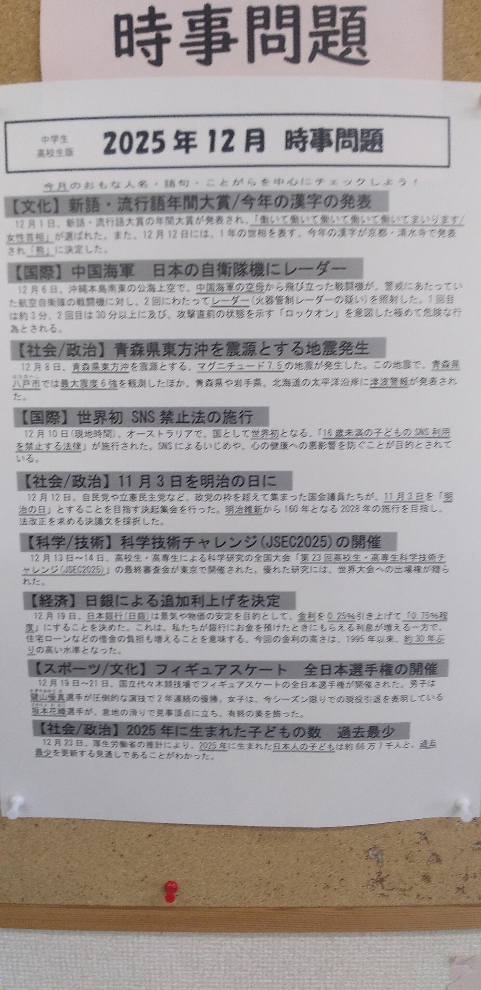 少し遅くなりましたが」12月の時事問題を貼り出しました。