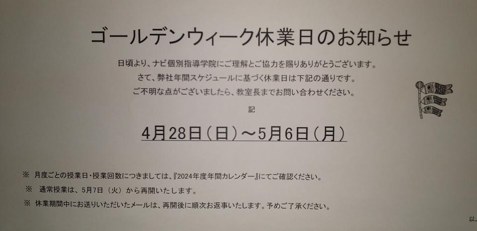 4月28日(日)~5月6日(月)は、ゴールデンウィークの休業日となっております。