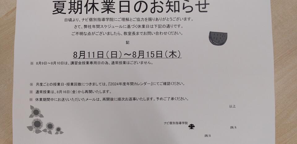 また、8/9(金)と8/10(土)は講習会専用日のため、通常の授業はございません。