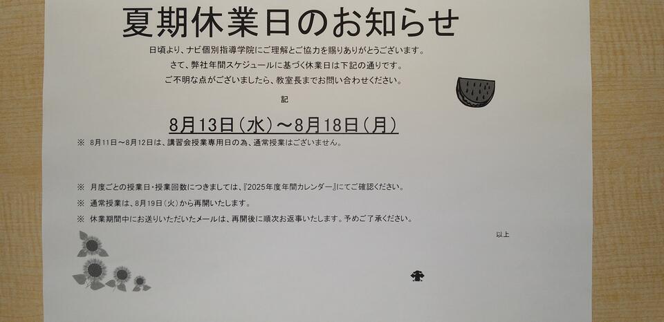 8月13日(水)~8月18日(月)は、お休みとなっております。