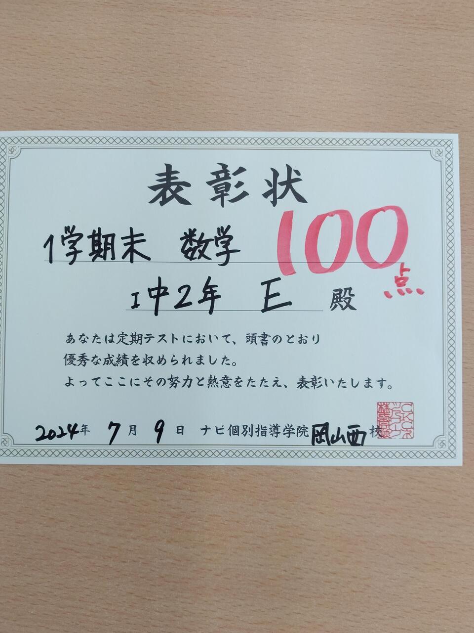 今回の1学期期末テストではなんと...数学100点!!!