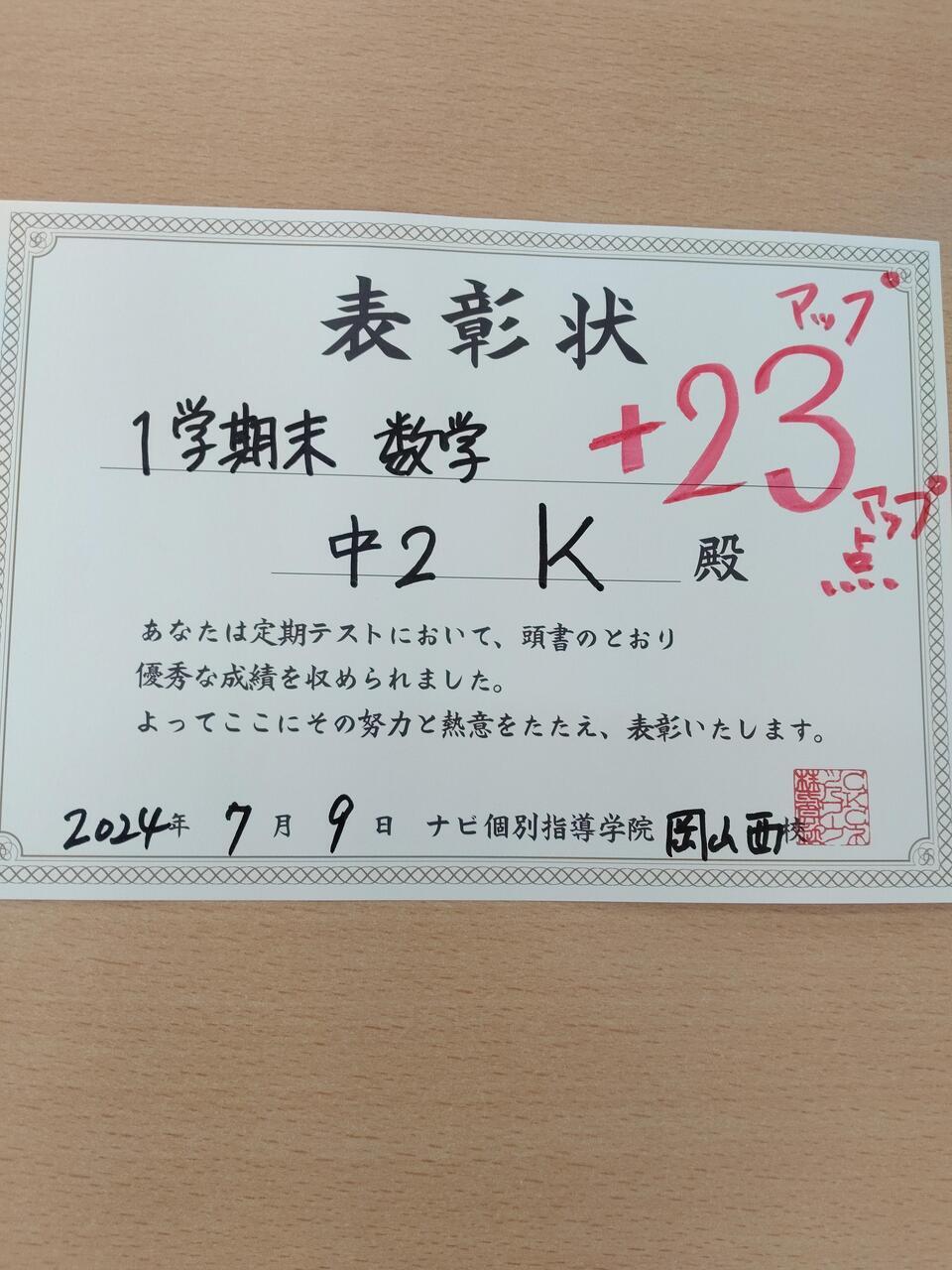 今回の2年1学期期末テストではなんと...23点アップ!!!