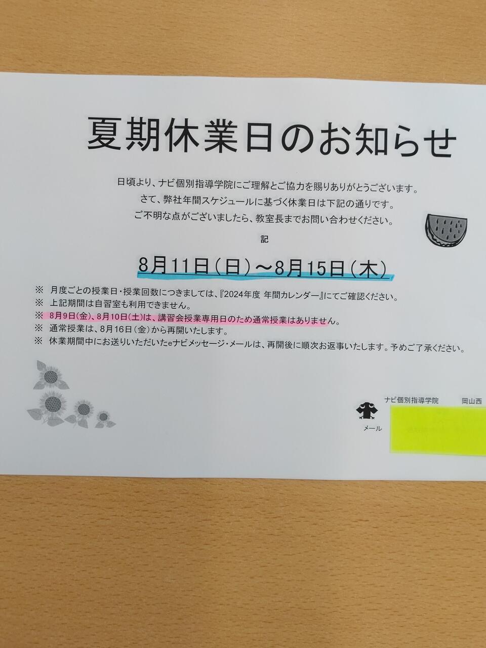 8/9(金)、8/10(土)は講習会専用日のため通常授業はありません。