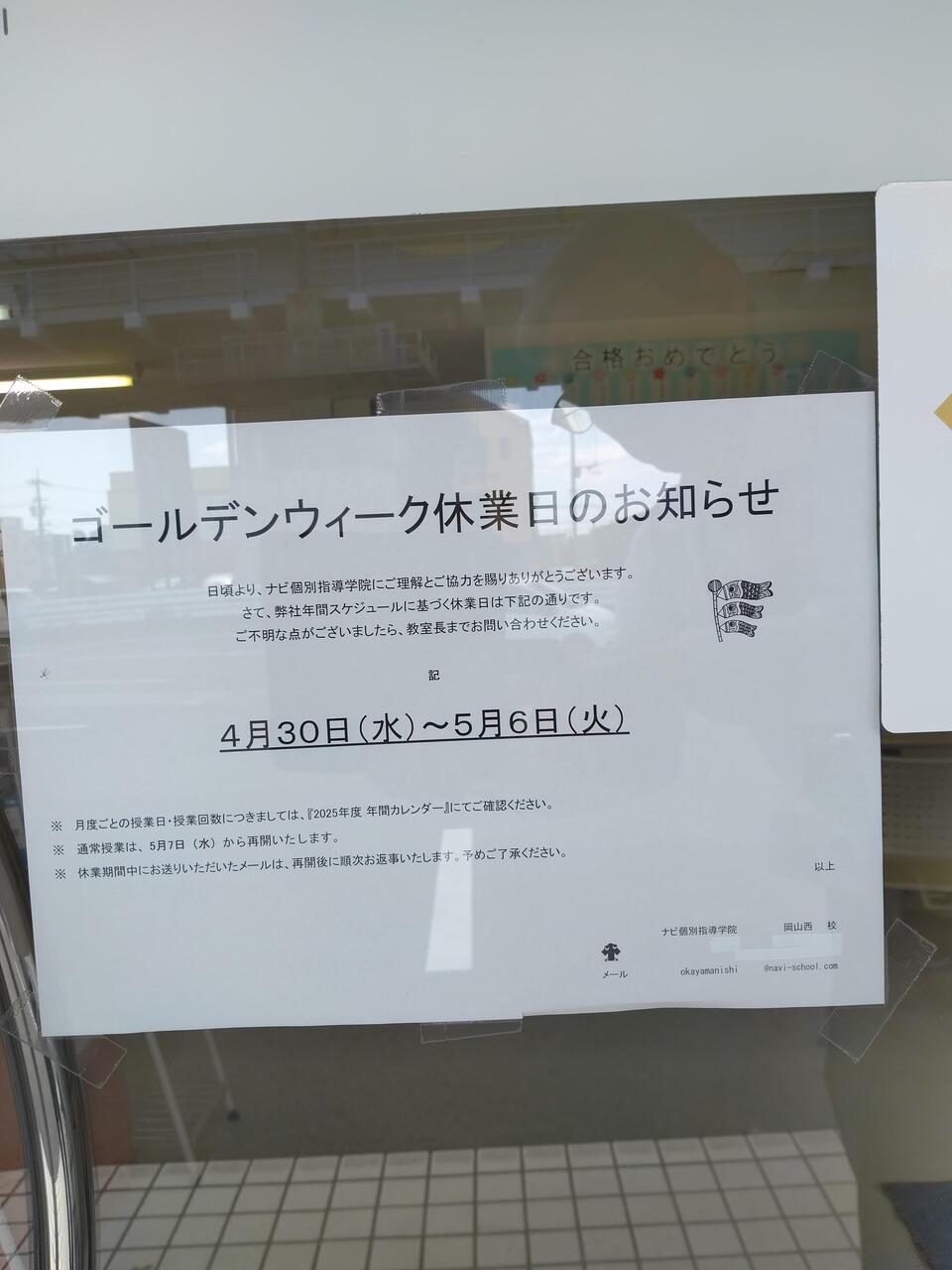 4月30日(水)~5月6日(火)上記期間は休業日で授業はありません。