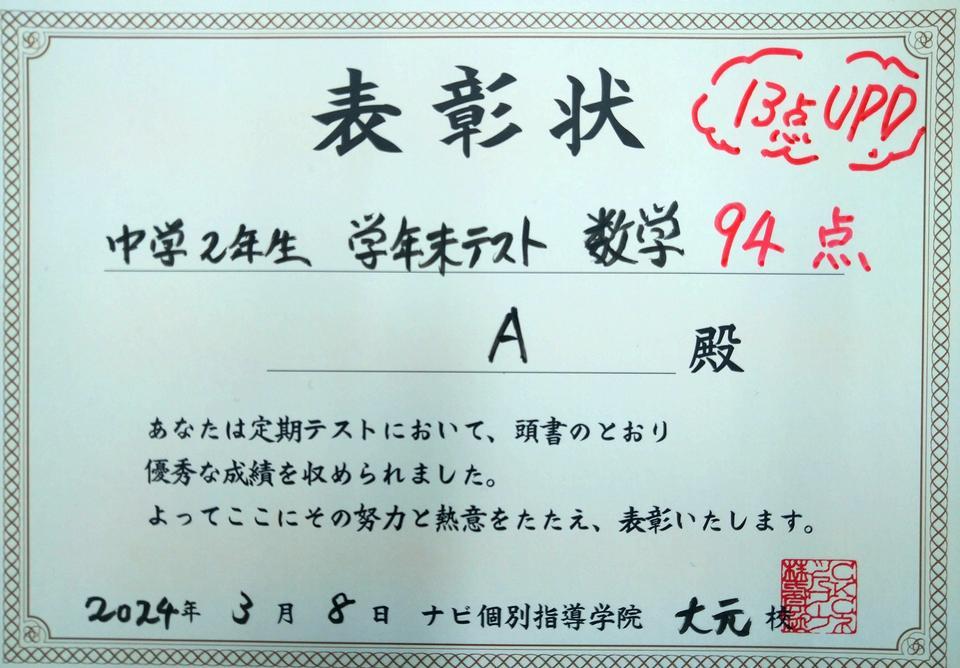 前回81点から更に13点UP!!素晴らしい!!全教科のテストで間違ったところのやり直しも必ずしましょうね。これも大切です。次は3年生1学期期末テストですね期待しています!!無料体験授業受付中!