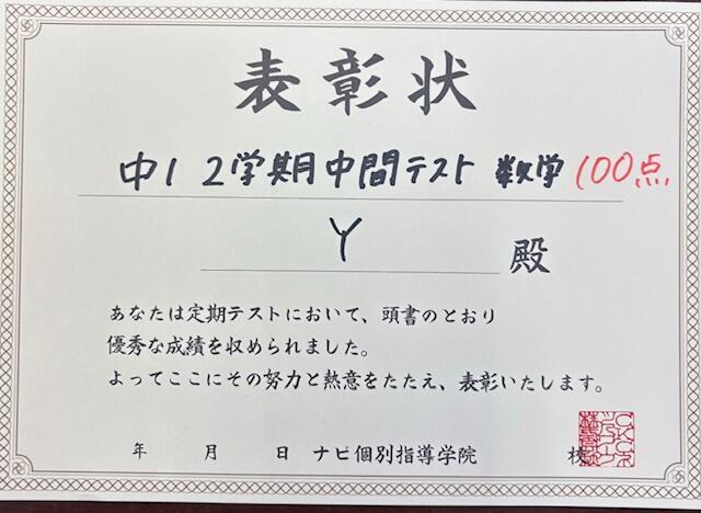 さて定期テストの中1の生徒さん受講科目数学100点!!