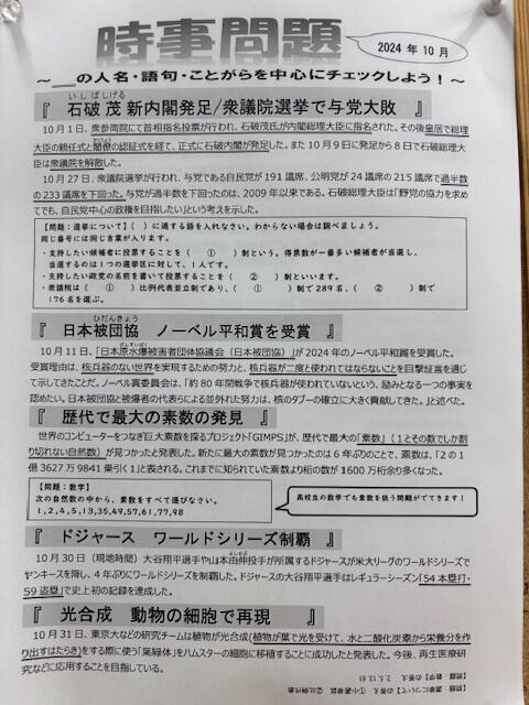 10月度時事問題を教室にて掲示中です。
