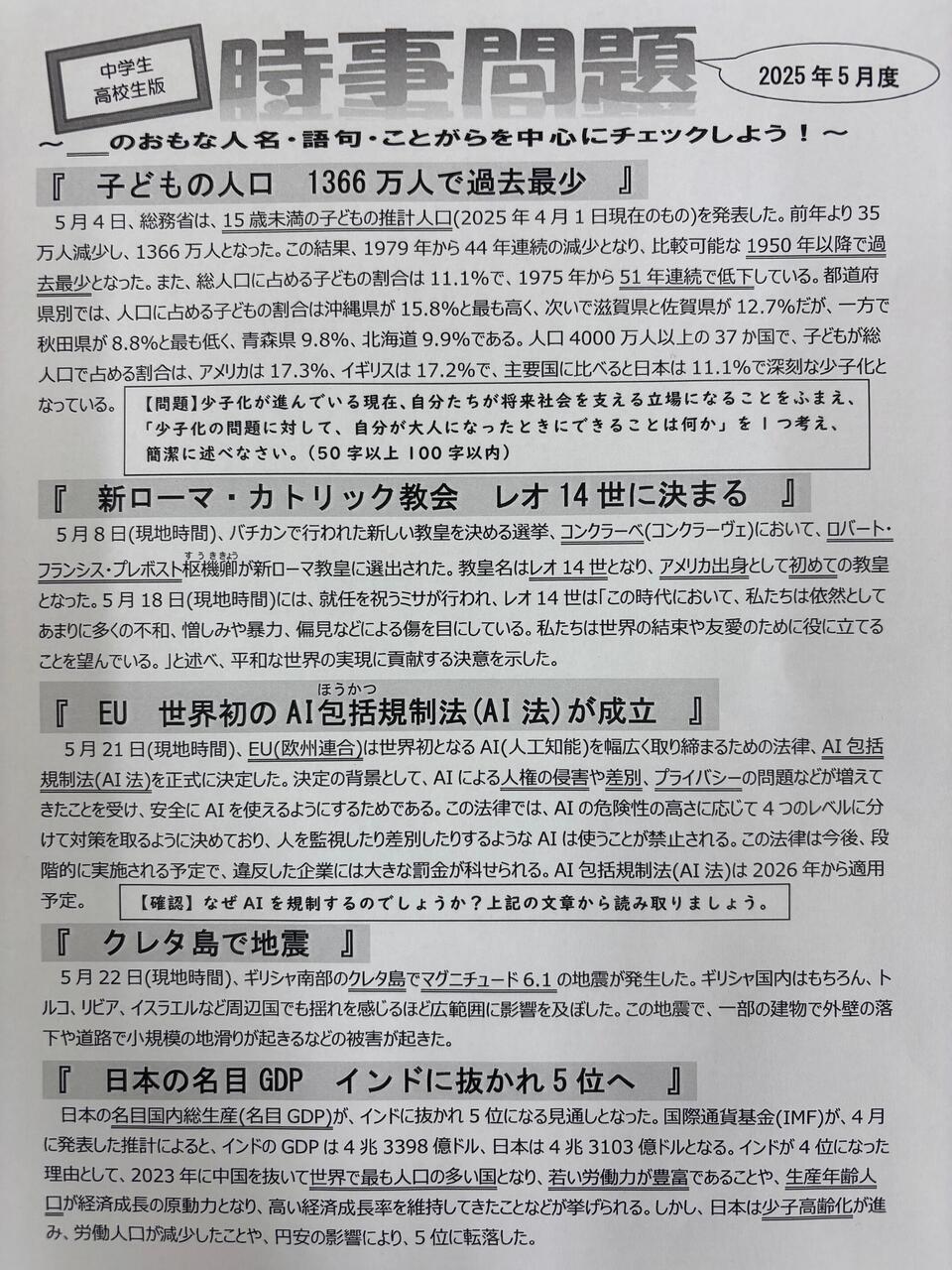 5月度時事問題を教室にて掲示中です。