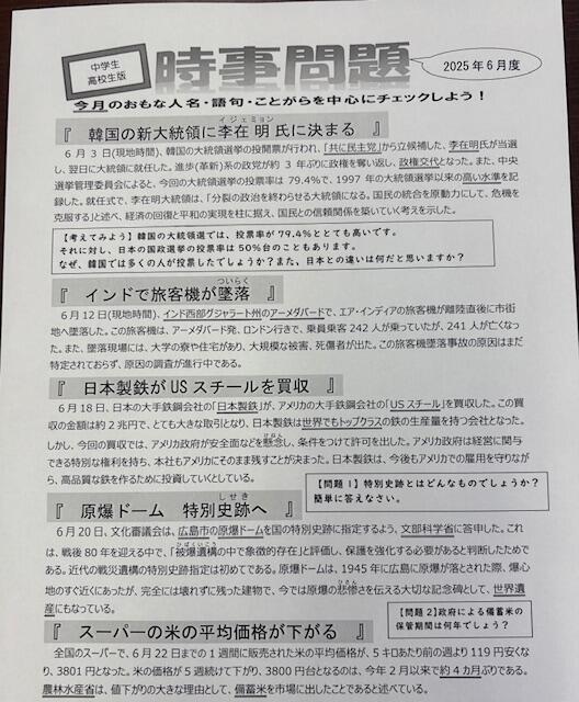 6月度時事問題を教室にて掲示中です。