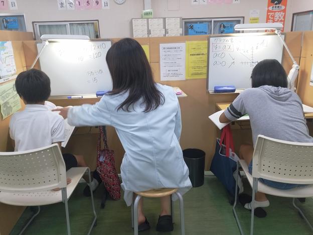 ナビ個別指導学院の授業は、個別の席ごとに設置された自分専用のホワイトボードで解き方や考え方を一緒に確認、それから生徒が問題を解くという「個別授業」スタイルです。
