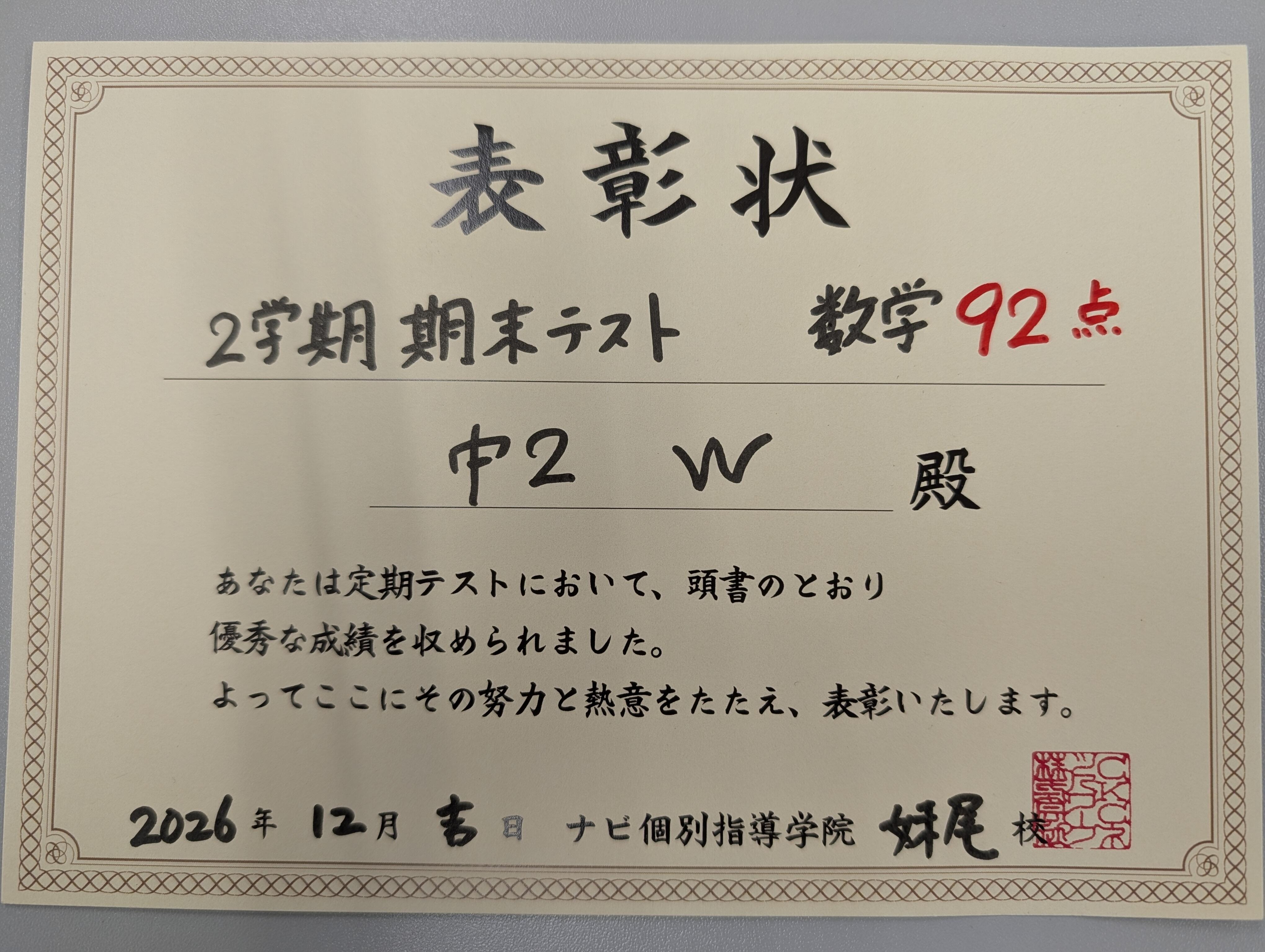 2学期期末テストで92点!