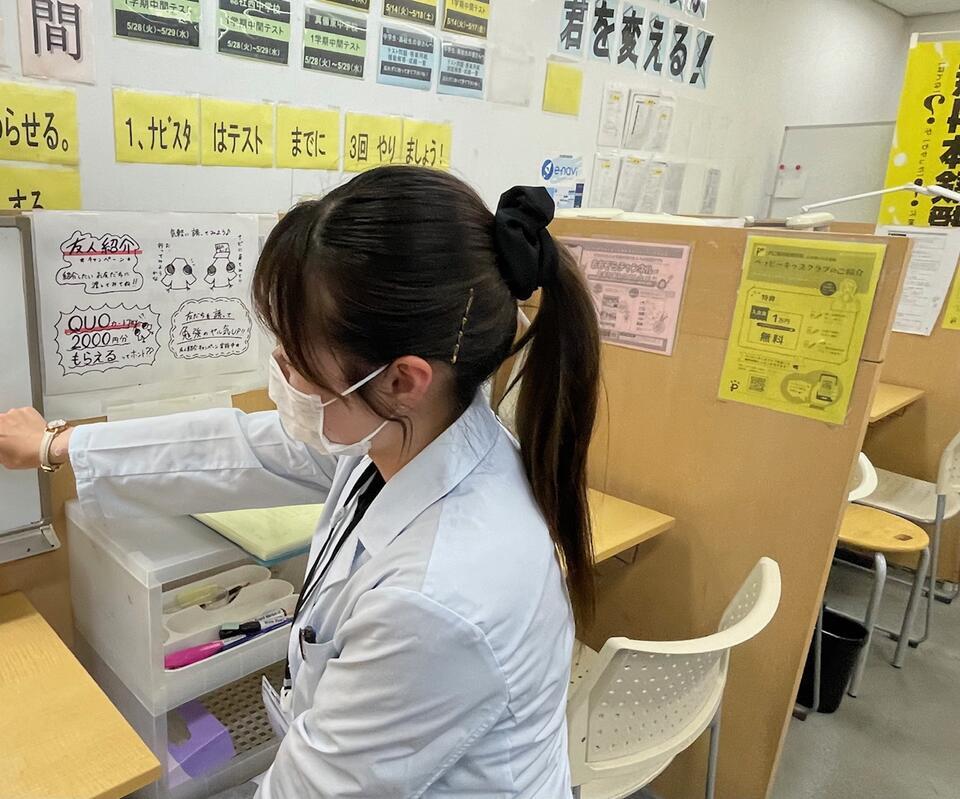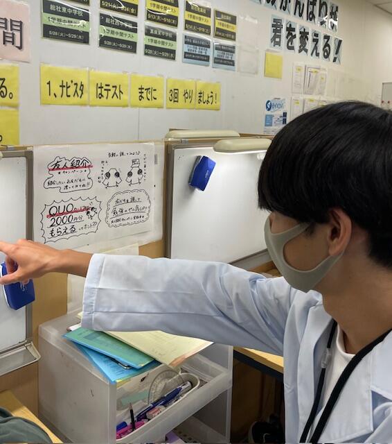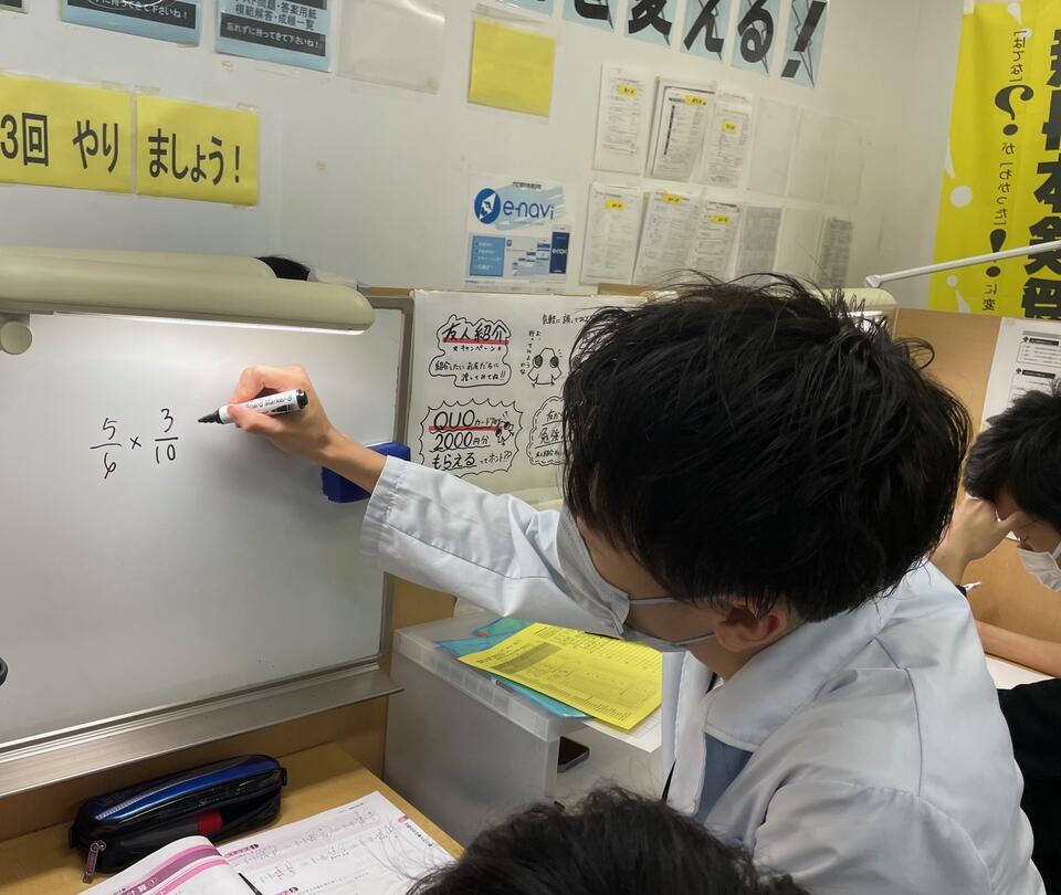 ナビ個別指導学院の授業は、個別の席ごとに設置された自分専用のホワイトボードで解き方や考え方を一緒に確認、それから生徒が問題を解くという「個別授業」スタイルです。