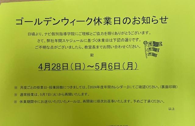 ゴールデンウィーク休業日のお知らせです。