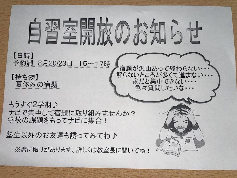8/20火、8/23金の2日間15:00~17:00自習室を開放します。