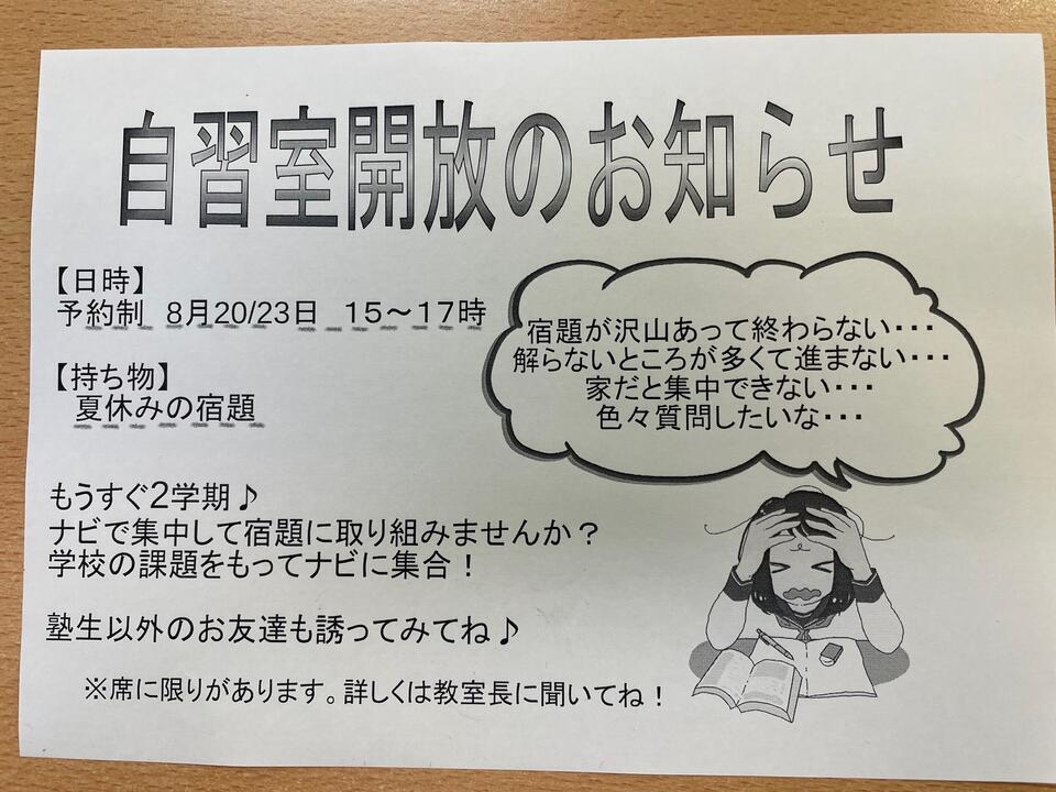 塾生の方でまだ課題の残っている方は8/20火、8/23金の自習室開放をご利用ください。