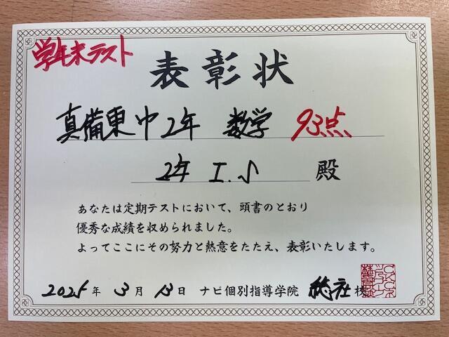真備東中学校 2年 I Sさん数学 93点!!