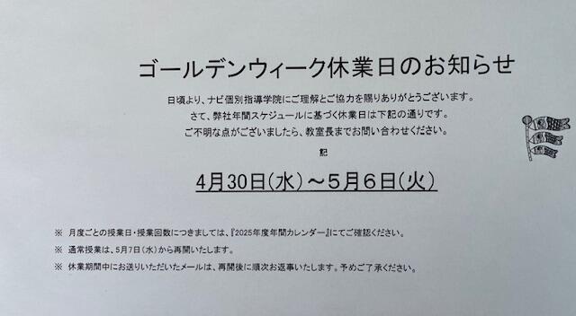 4/30水~5/6火までお休みとさせていただきます。