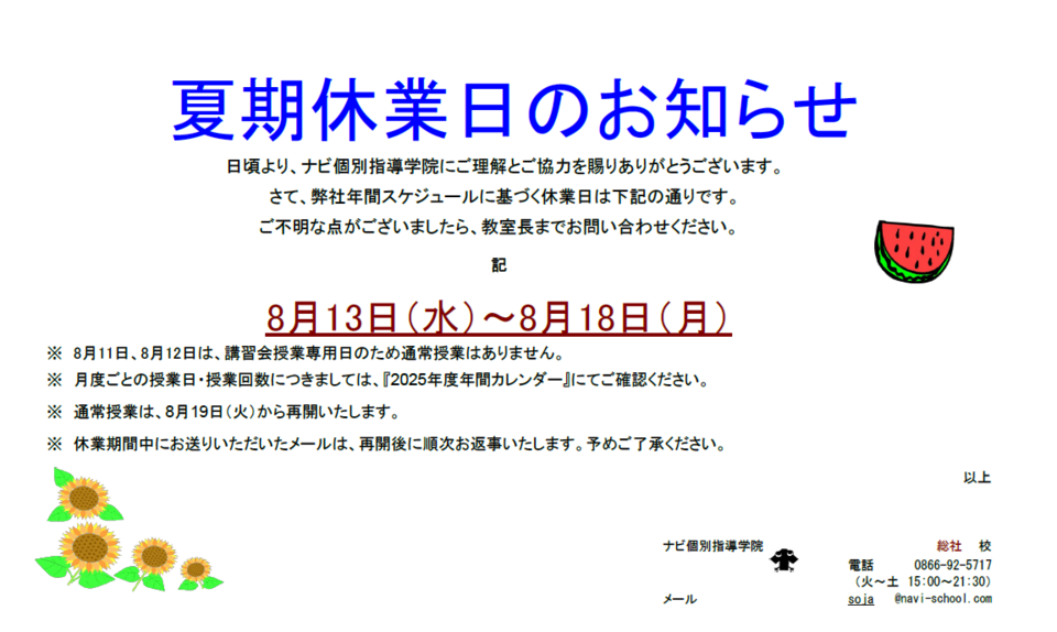※8月11日・12日は講習会専用日の為、通常授業はお休みです。