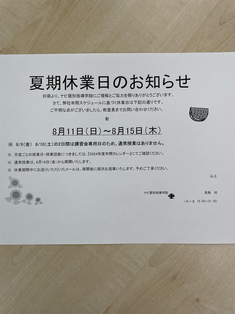 本日は夏期休業のお知らせをいたします。8月11日(日)~8月15日(木)は通常授業がお休みとなります。8月9日~8月10日は講習会専用日。8月11日~8月15日は終日お休みとなっております。お間違いないようよろしくお願いいたします。皆様、良いお盆休みをお過ごしください