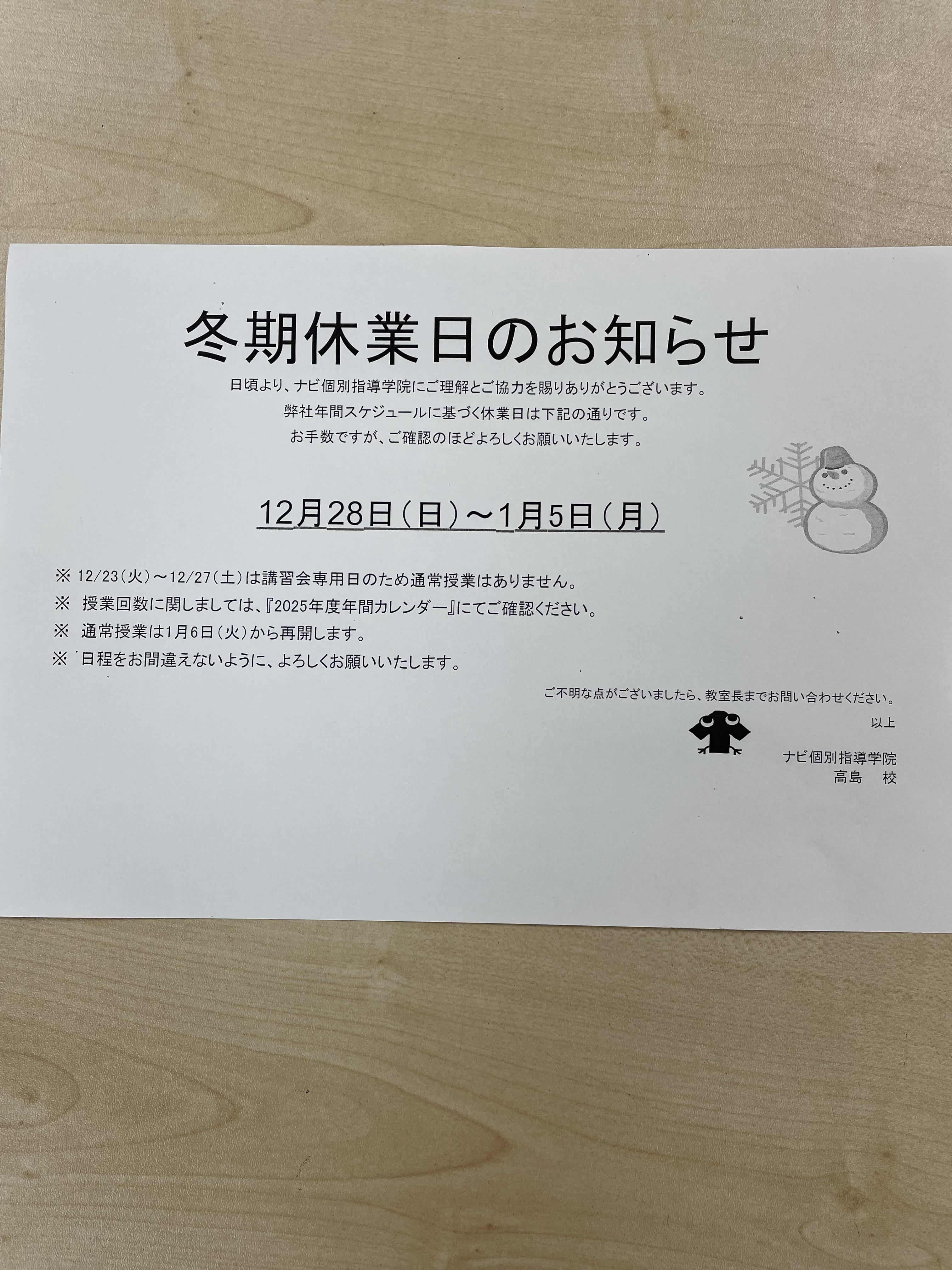 冬期休業のお知らせをさせていただきます。