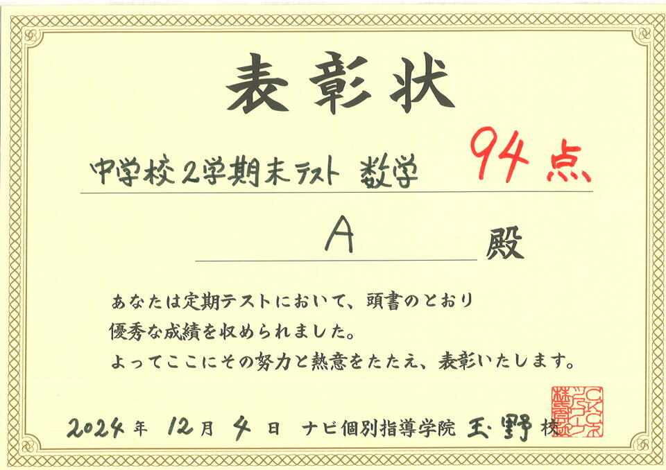 前回は82点で今回12点UP!!すごい!!全教科のテストで間違ったところの見直し・やり直しも必ずしましょうね。これも大切です。次は2年生学年末テストですね!とても重要です。期待しています!!無料体験授業受付中!