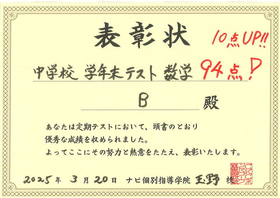 Bさん(中2) 数学 94点!!