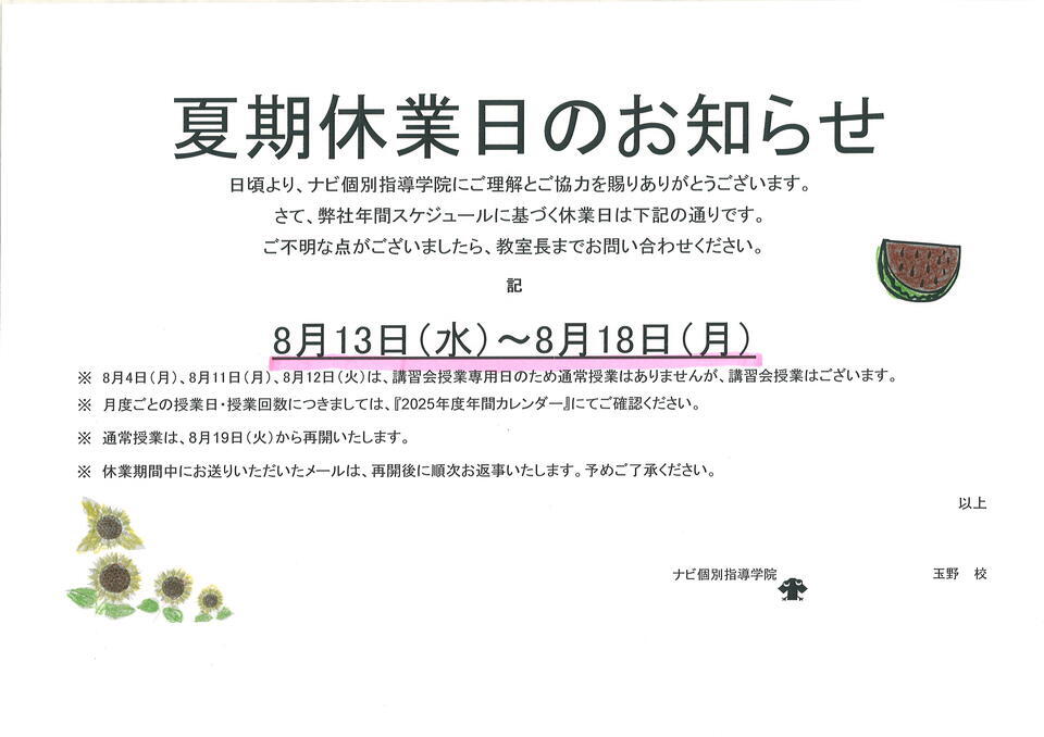 本日は夏期休業日のお知らせをいたします。8月13日(水)~8月18日(月)は通常授業がお休みとなります。