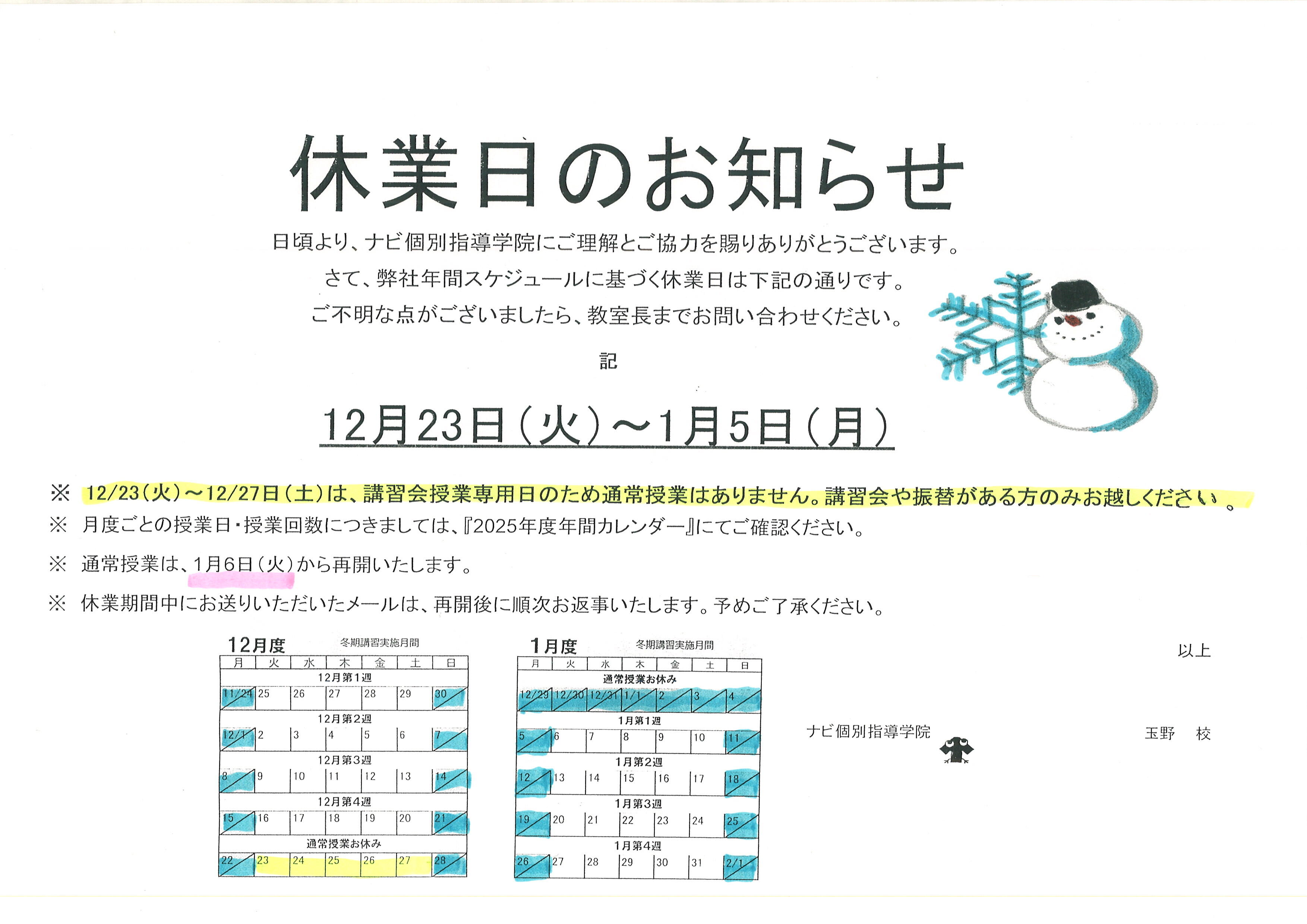 (冬期講習、入試対策講座、振替授業は実施しております)