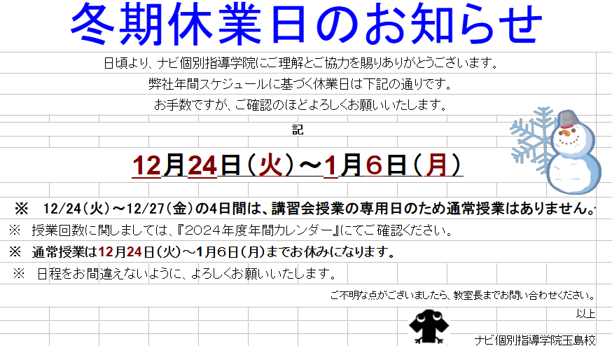 ※12/24(火)~12/27(金)は講習会授業の専用日のため通常授業はありません。