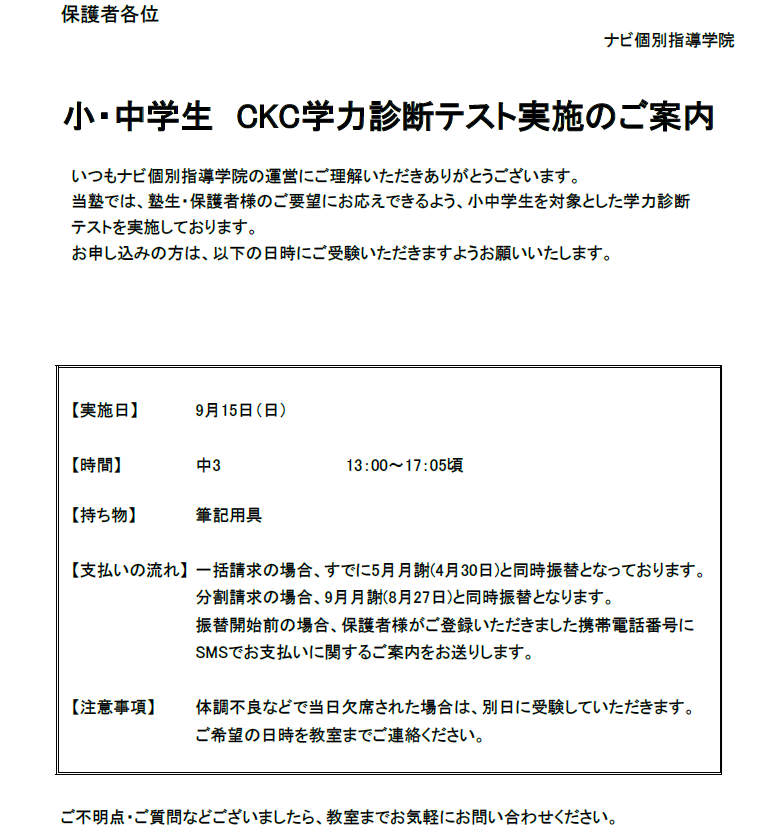 9/15(土)は中3生対象の学力診断テストとなっております。