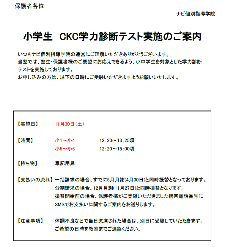 今週11/30(土)は小学生を対象にした学力診断テストです。