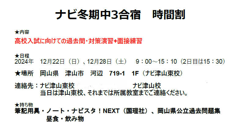 12/22(日)は中3を対象とした冬期勉強合宿があります。