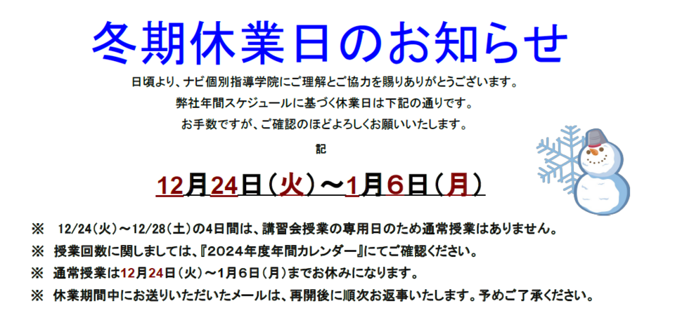 冬期休業日となり、通常授業はなく講習会授業のみとなります。