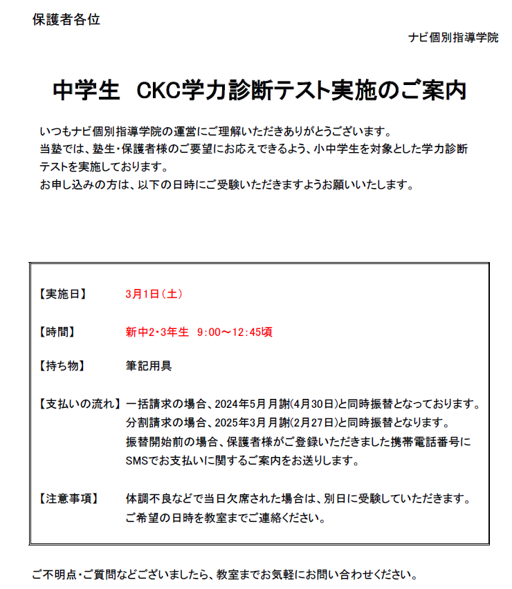 今週3/1(土)は中学生を対象とした学力診断テストがあります。