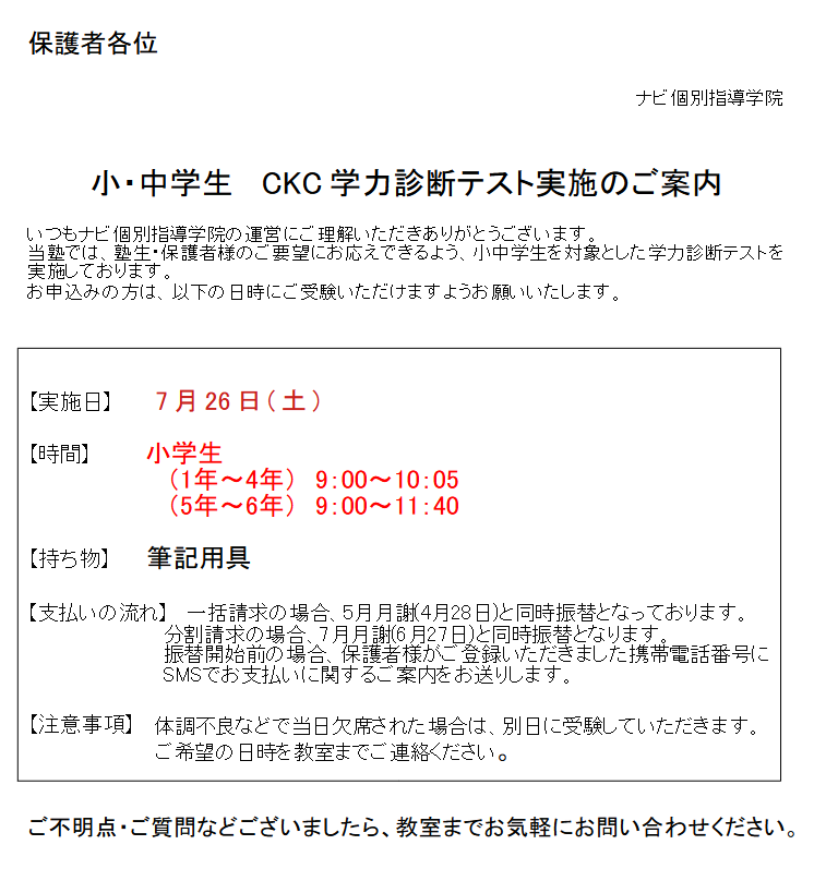 中1.2年生を対象としたの学力診断テストの実施を