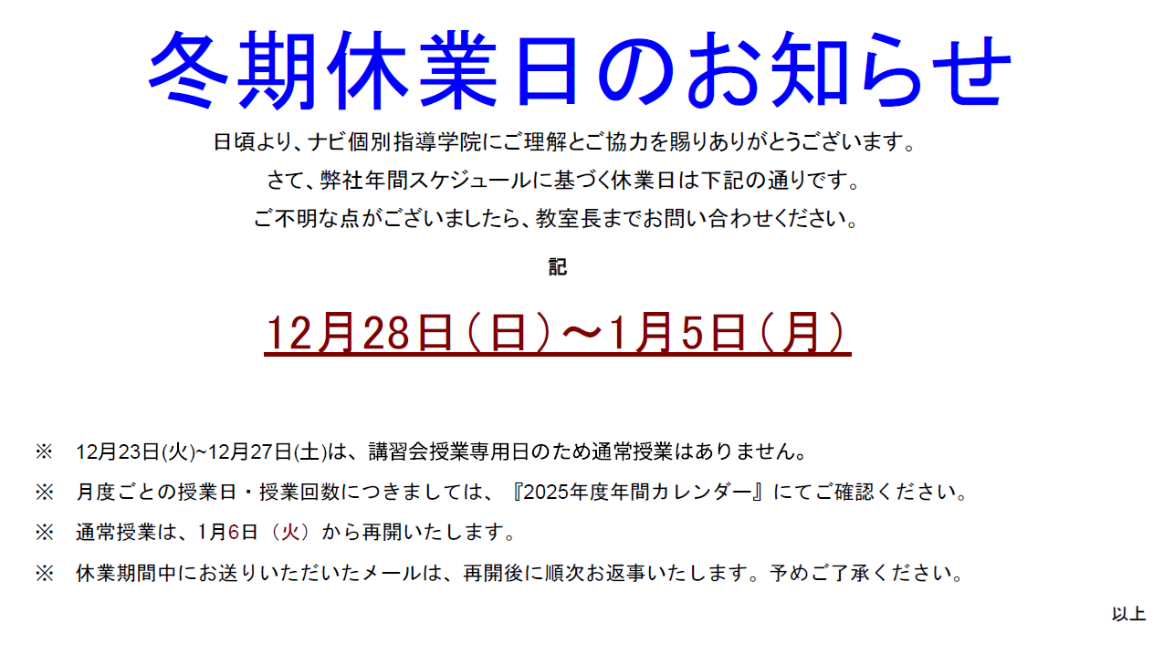 ・通常授業は1月6日(火)より再開いたします。
