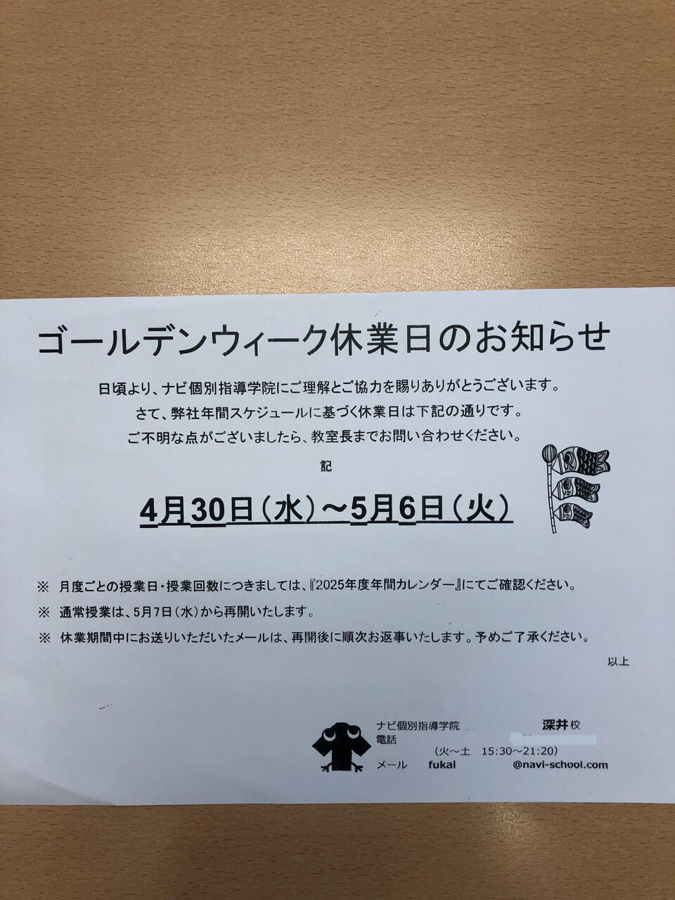 堺市中区にお住まいの皆さん、こんにちは!個別指導塾のナビ個別指導学院深井校です! もうすぐやってくるGWを楽しみにしている生徒さんも多いのではないでしょうか?当教室の休業日をご案内しますので、間違えて通塾してしまわないようにしてください。 ~4月29日(火):通常通り4月30日(水)~5月6日(火):GW休業&休日5月7日(水)~:通常通り となります。色がついている日程は自習室利用もお休みとなっておりますのでご注意ください。GW明けにたくさんの質問を受け付けますので、溜め込んでおいてください(^o^) よいGWをお過ごしください。