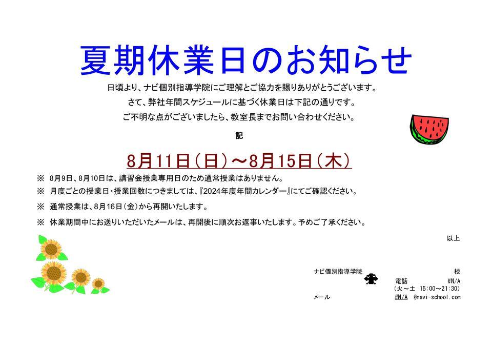 8月9日(金)~10日(土):講習会専用日 (通常授業無し)