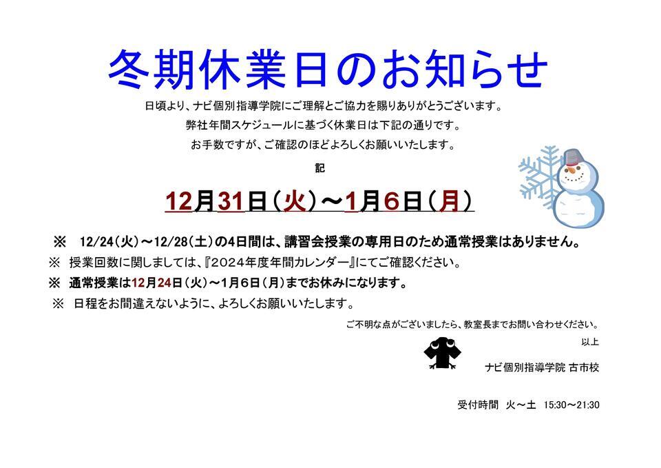 ナビ個別指導学院 古市校の冬期休業も生徒の皆さんにはお伝えしておりますが、