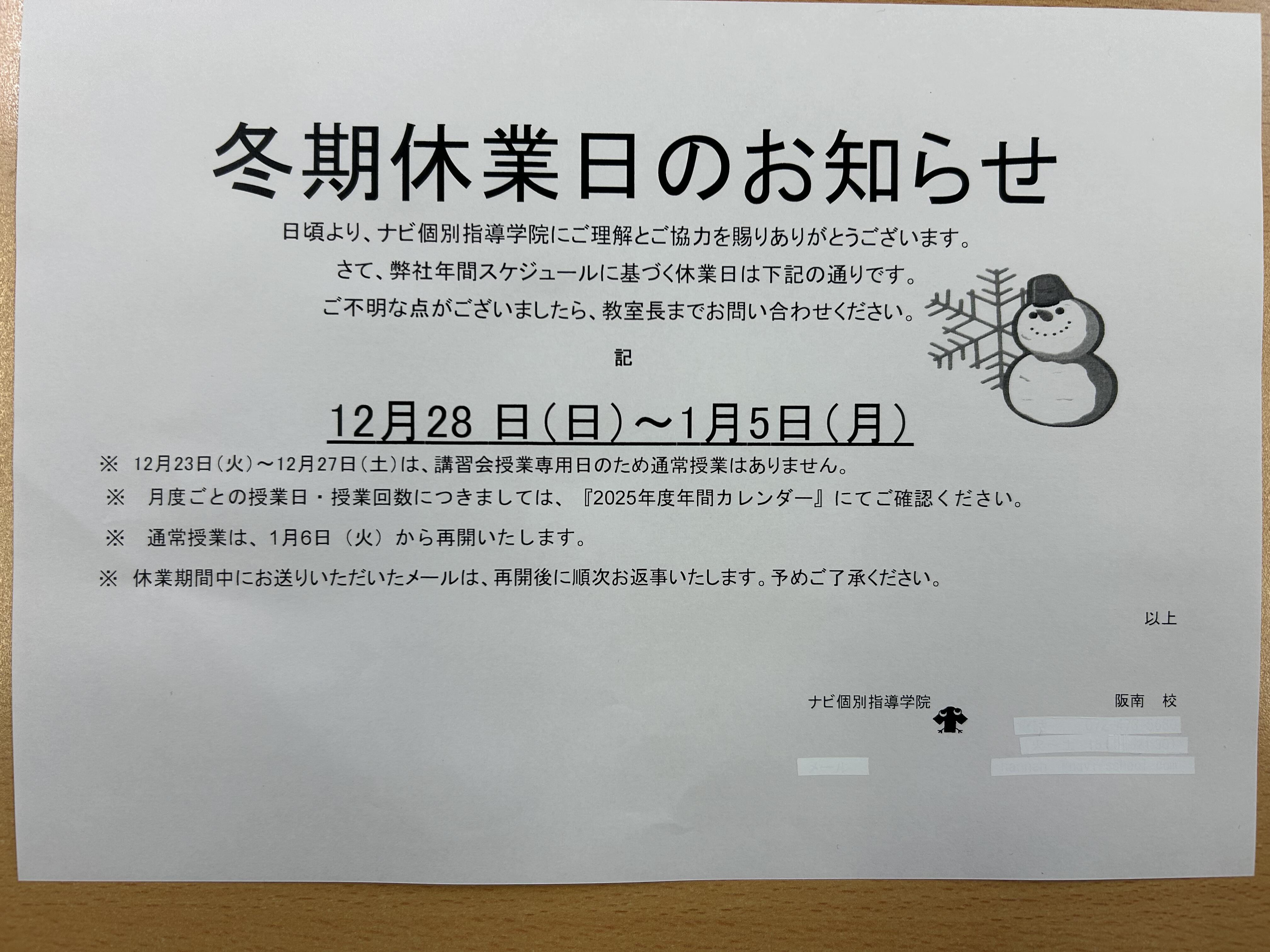 尚、12/23(火)~1/5(月)は通常授業もお休みとなり