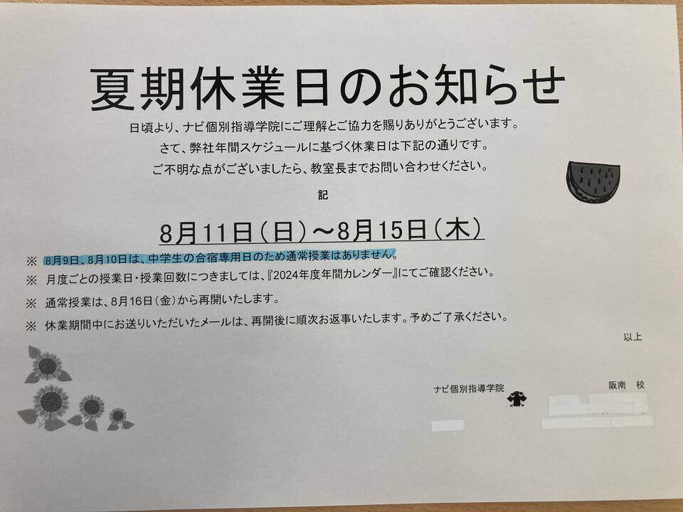 今日は夏期休業についてお知らせいたします。