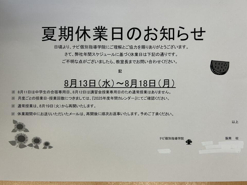 その為、8/12(火)~8/18(月)は通常授業はありませんので間違ってくることのない様にお願いいたします。