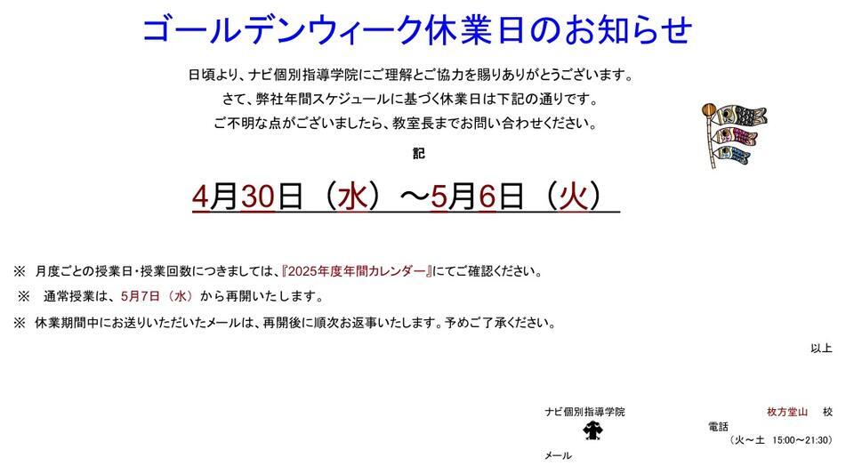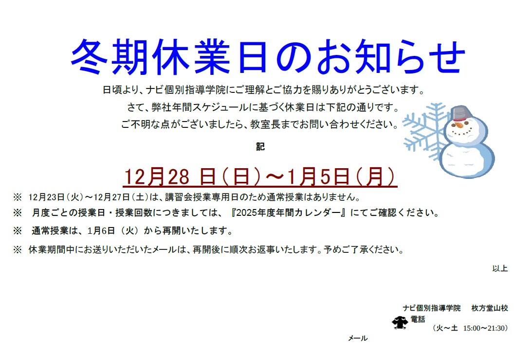 ナビ個別指導学院 枚方堂山校の冬期休業も生徒の皆さんにはお伝えしておりますが、