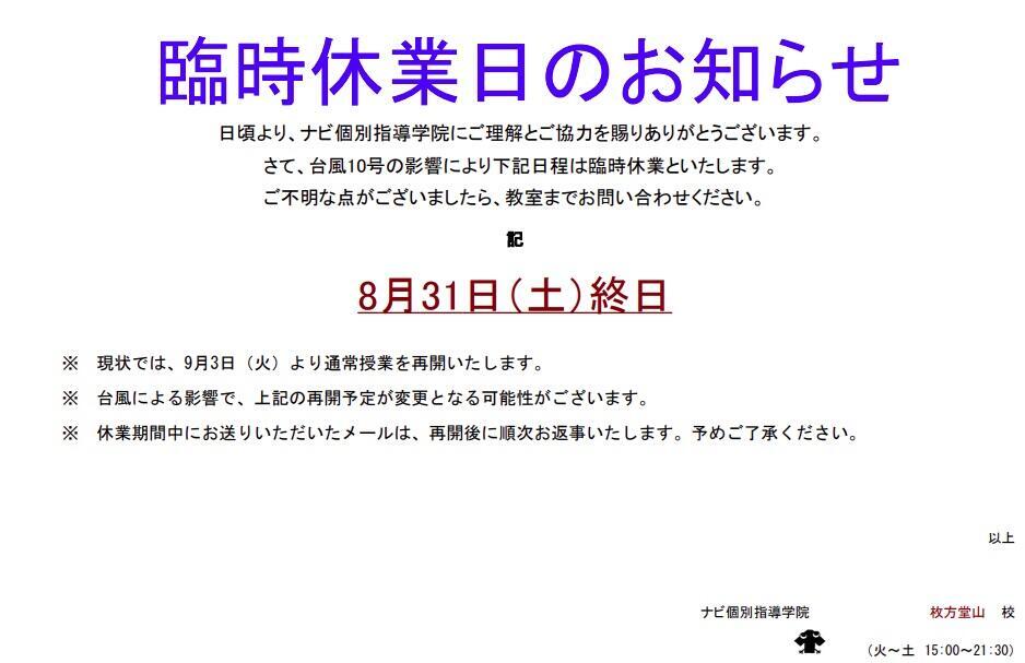 平素はナビ個別指導学院をご利用いただき、誠にありがとうございます。本日8/30(金)は台風による影響がなさそうなので、通常どおり開講いたします。また、明日8/31(土)ですが、悪天候による警報発令のため、明日の営業をお休みとさせていただきます。授業だけではなく、学力テストや自習室も利用できませんのでご注意ください。尚、体験授業のお問合せなどに関しては週明け以降のご連絡になりますのでご了承いただけたらと思います。皆様も十分お気をつけてお過ごしください。3日以降は通常通りに運営予定ですのでよろしくお願いいたします!ナビ個別指導学院 枚方堂山校 教室長