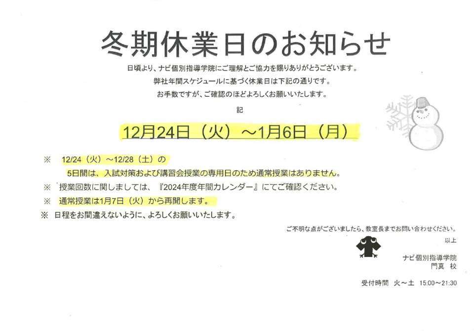 ナビ個別指導学院 門真校の冬期休業も生徒の皆さんにはお伝えしておりますが、
