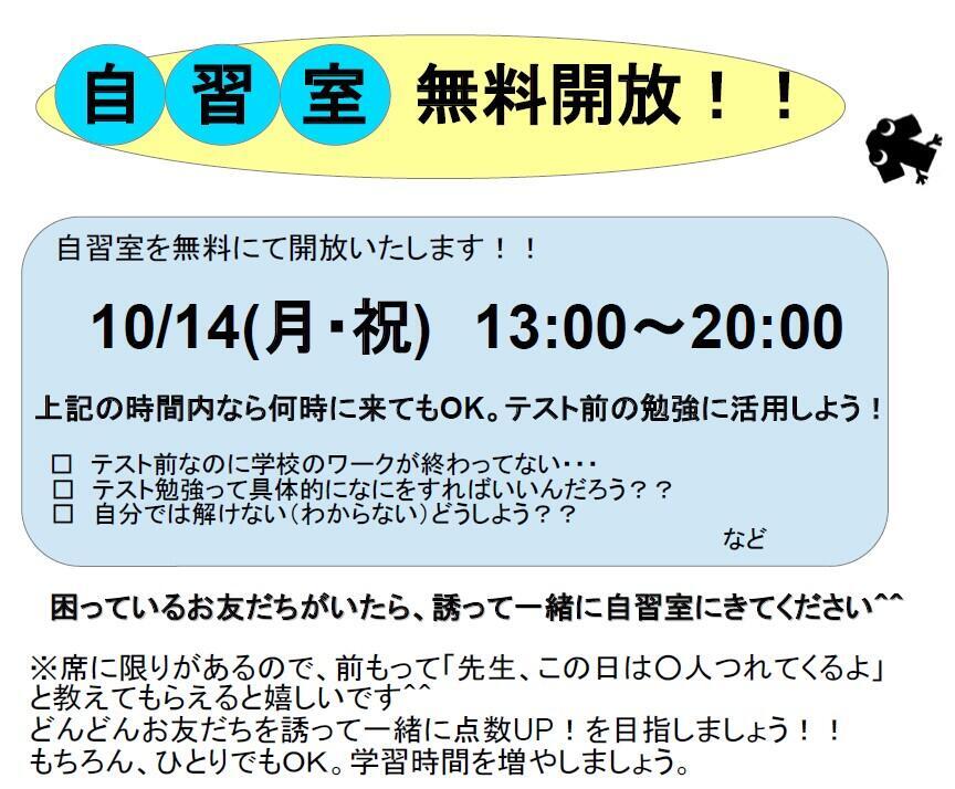 そこで、直前の14日(月・祝)は自習室を開放します。