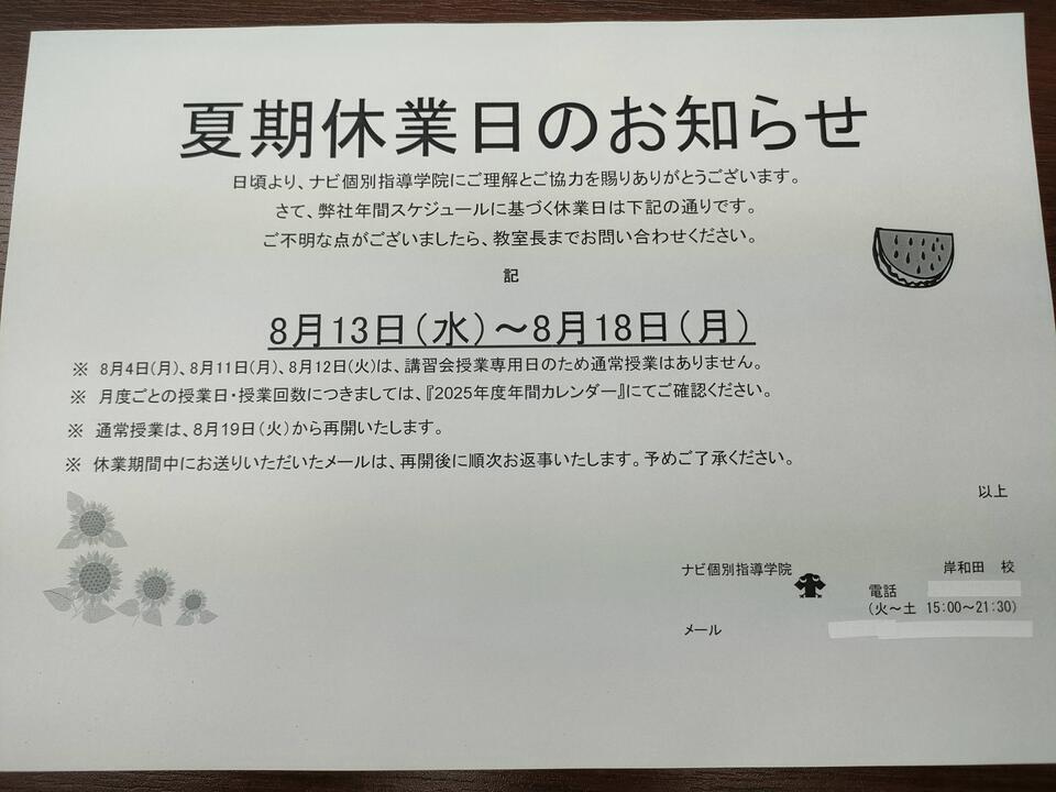 お世話になっております。ナビ個別指導学院岸和田校の北村です。夏期休業日のお知らせです。下記スケジュールご確認よろしくお願いいたします。8/11(月)~8/12(火)開校日(通常授業なし、講習授業、振替、合宿などあり)8/13(水)~8/18(月)夏期休業日8/19(火)~通常授業再開以上、よろしくお願いいたします。