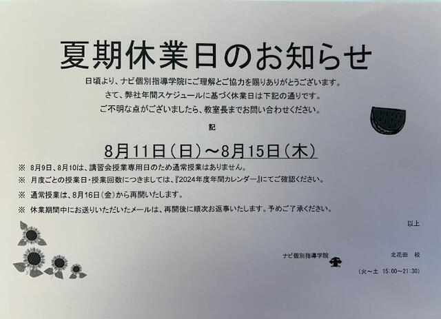 今後ともナビ個別指導学院北花田校をよろしくお願いいたします