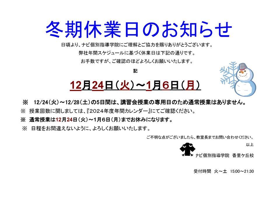 ナビ個別指導学院 香里ヶ丘校の冬期休業も生徒の皆さんにはお伝えしておりますが、こちらにも掲示させていただきます。